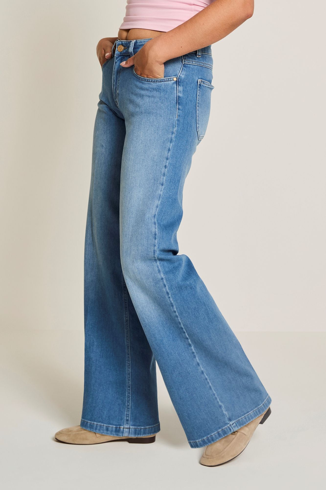 Mira heeft een hoge taille. De broek zit ruim bij de bovenbenen en heeft een extra breed uitlopende pijp.